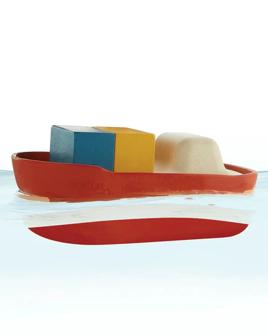 Safely carry your imaginary cargo, goods, and materials from one port to another with the floatable Rubber Cargo Ship from Plan Toys.